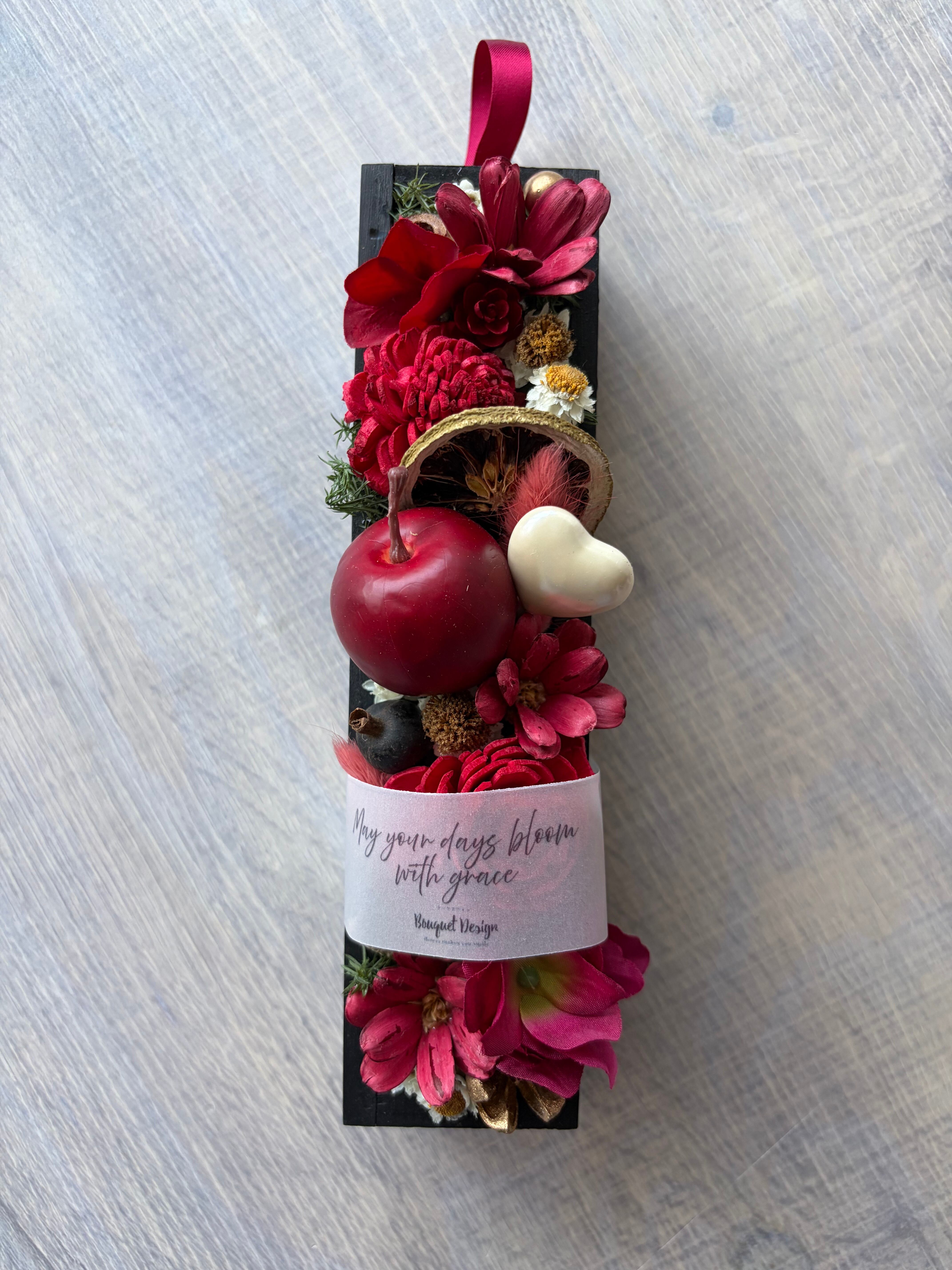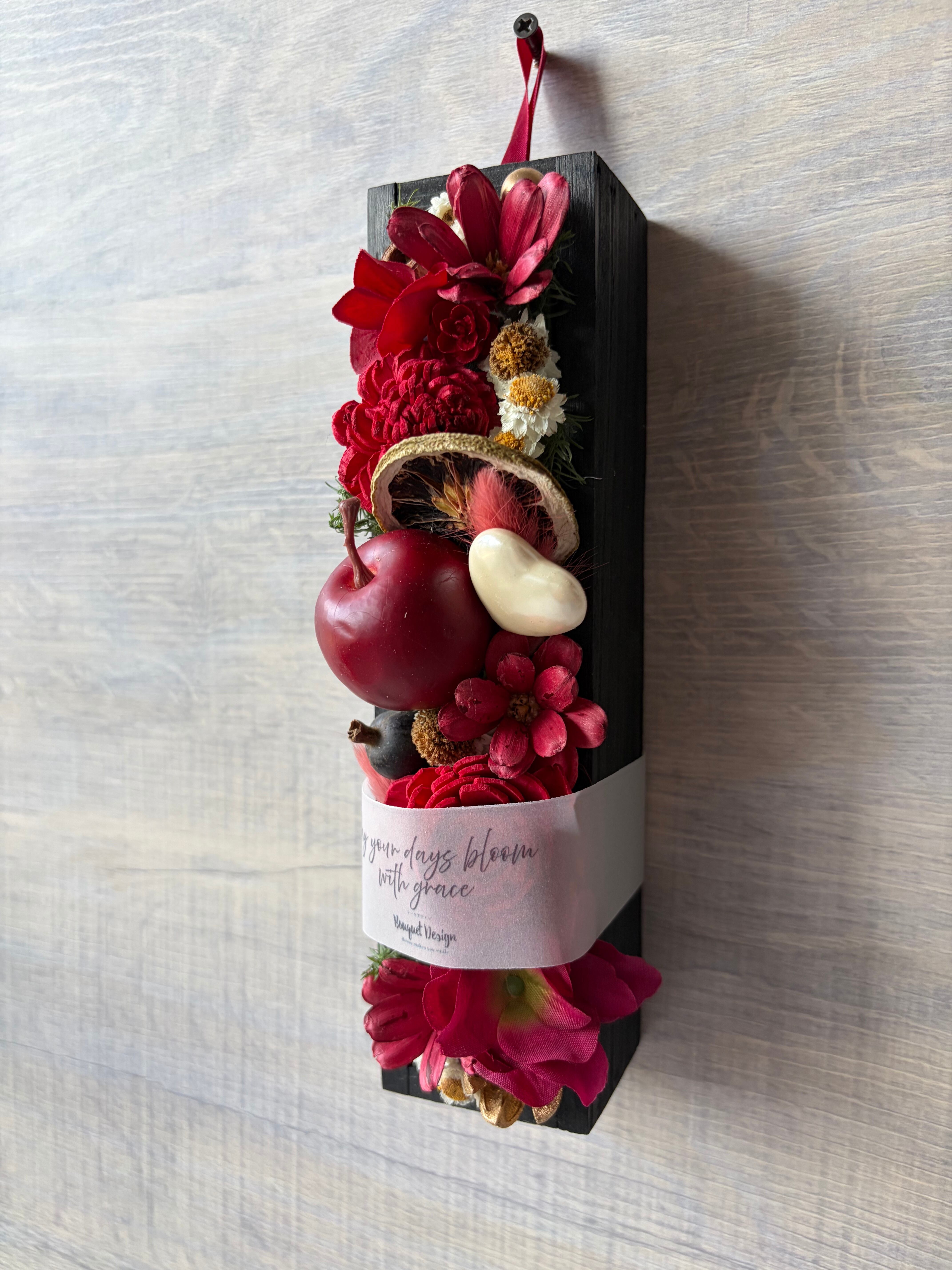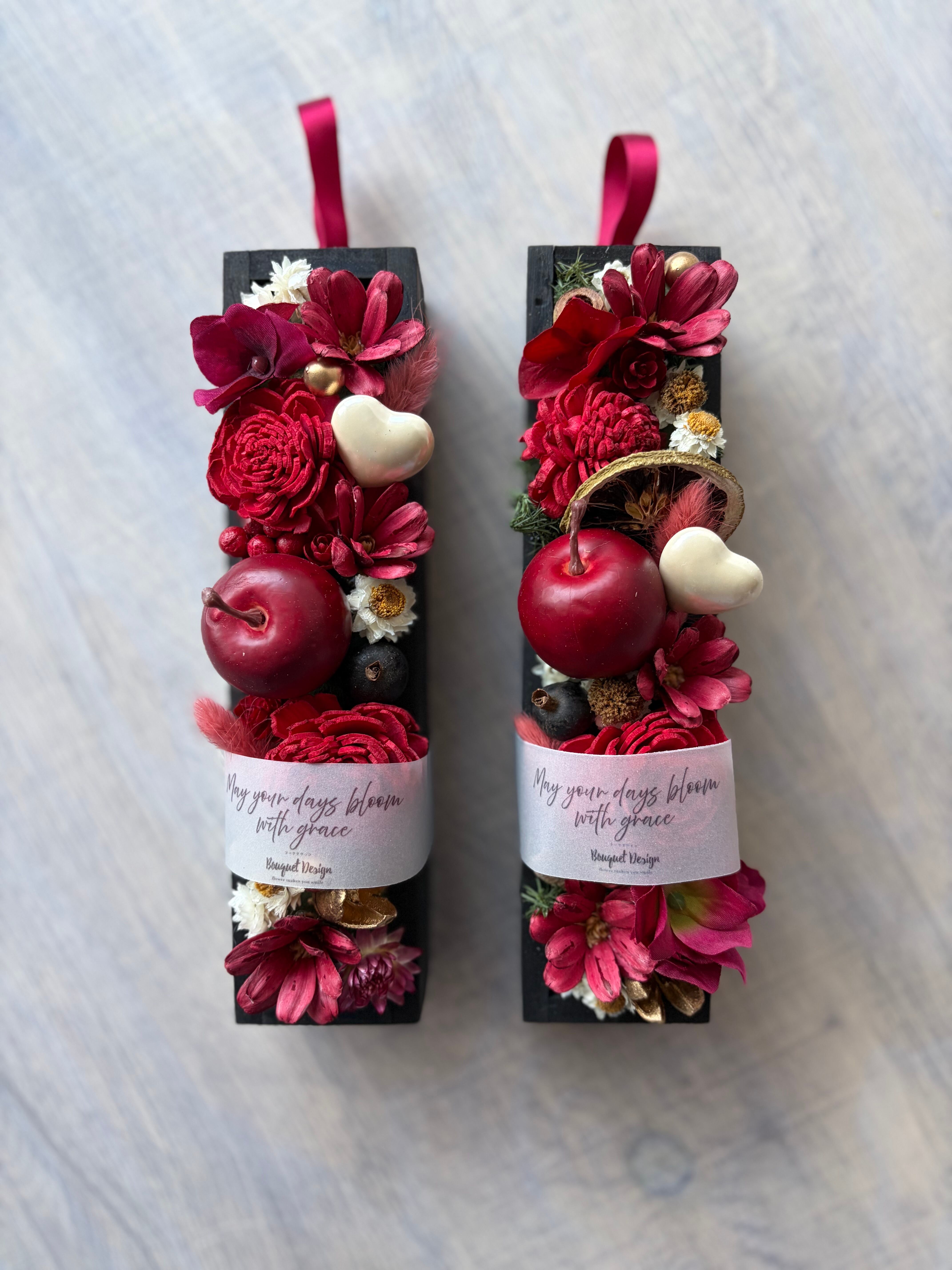 深みのあるルージュカラーを基調に、厳選したドライフラワーや木の実を一つひとつ丁寧に配置したBloom Box。