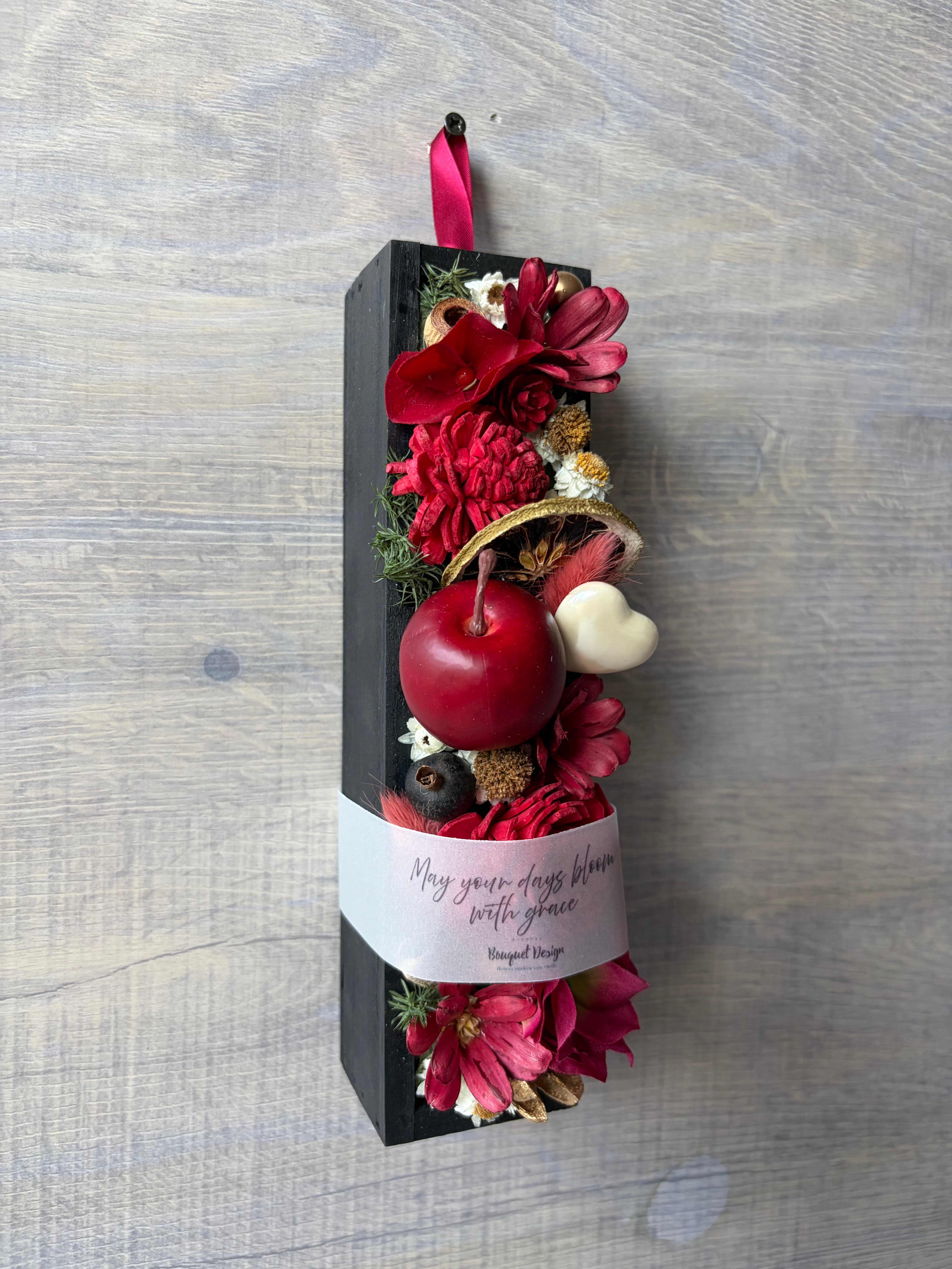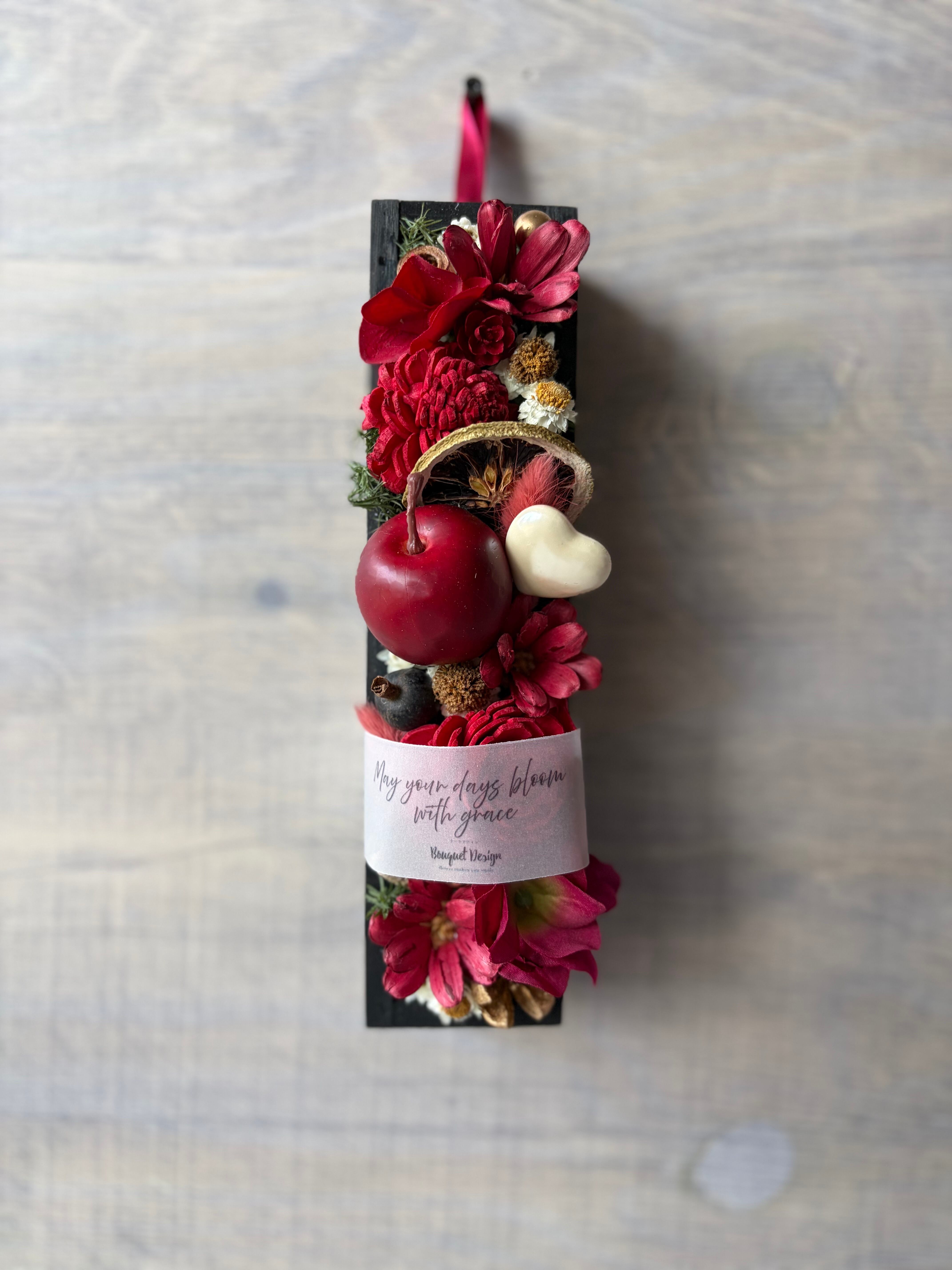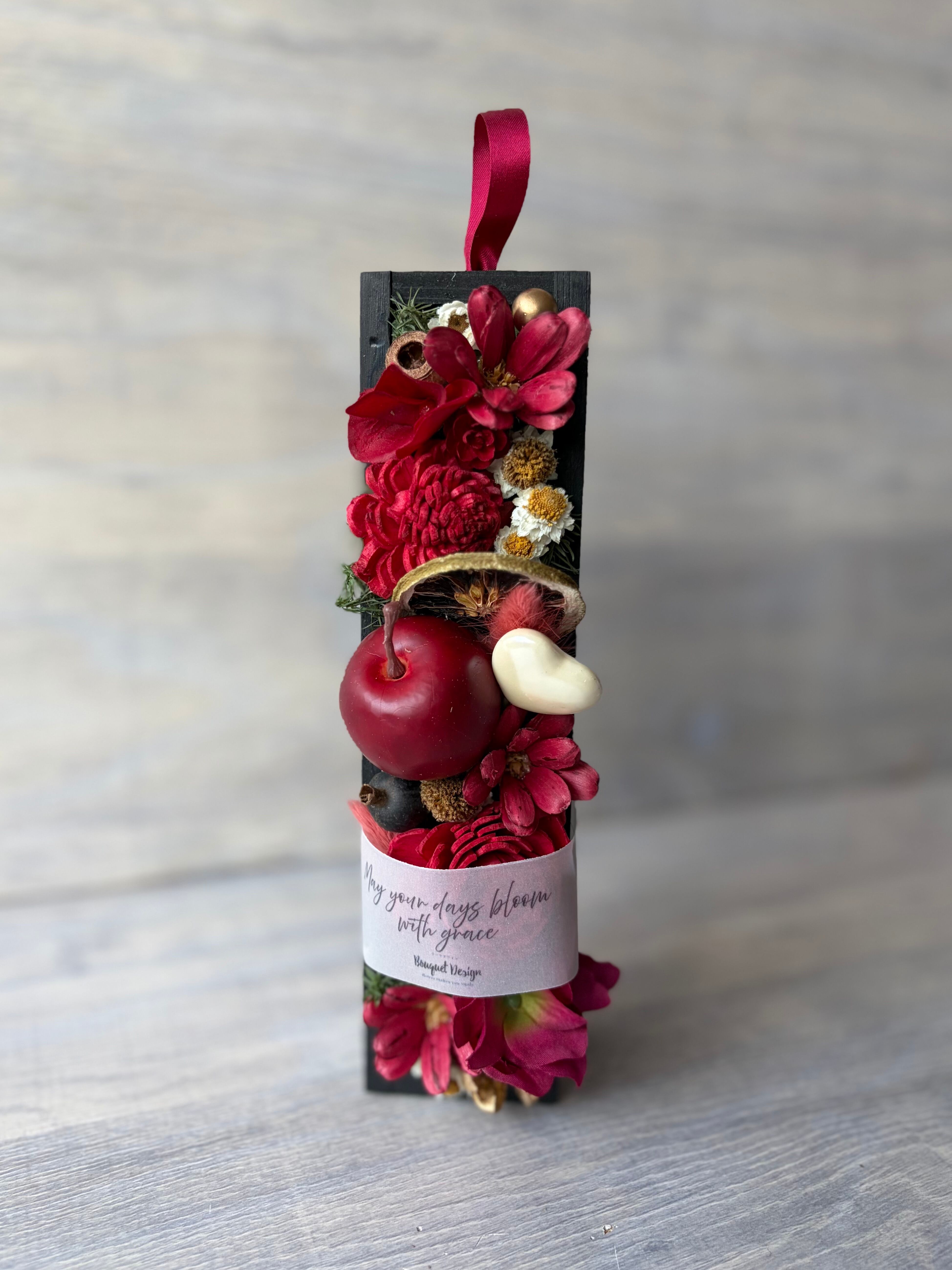 深みのあるルージュカラーを基調に、厳選したドライフラワーや木の実を一つひとつ丁寧に配置したBloom Box。