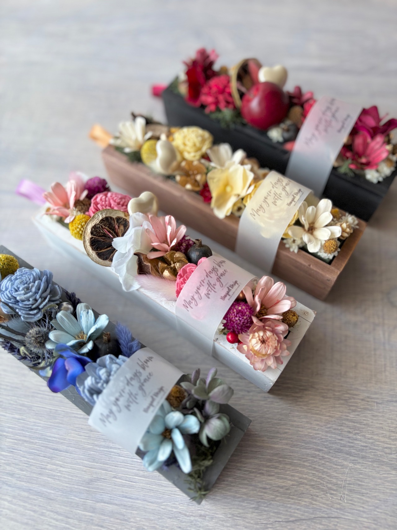 ドライやソープフラワー、アーティフィシャルフラワーを使用した1点ものでございます。