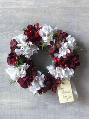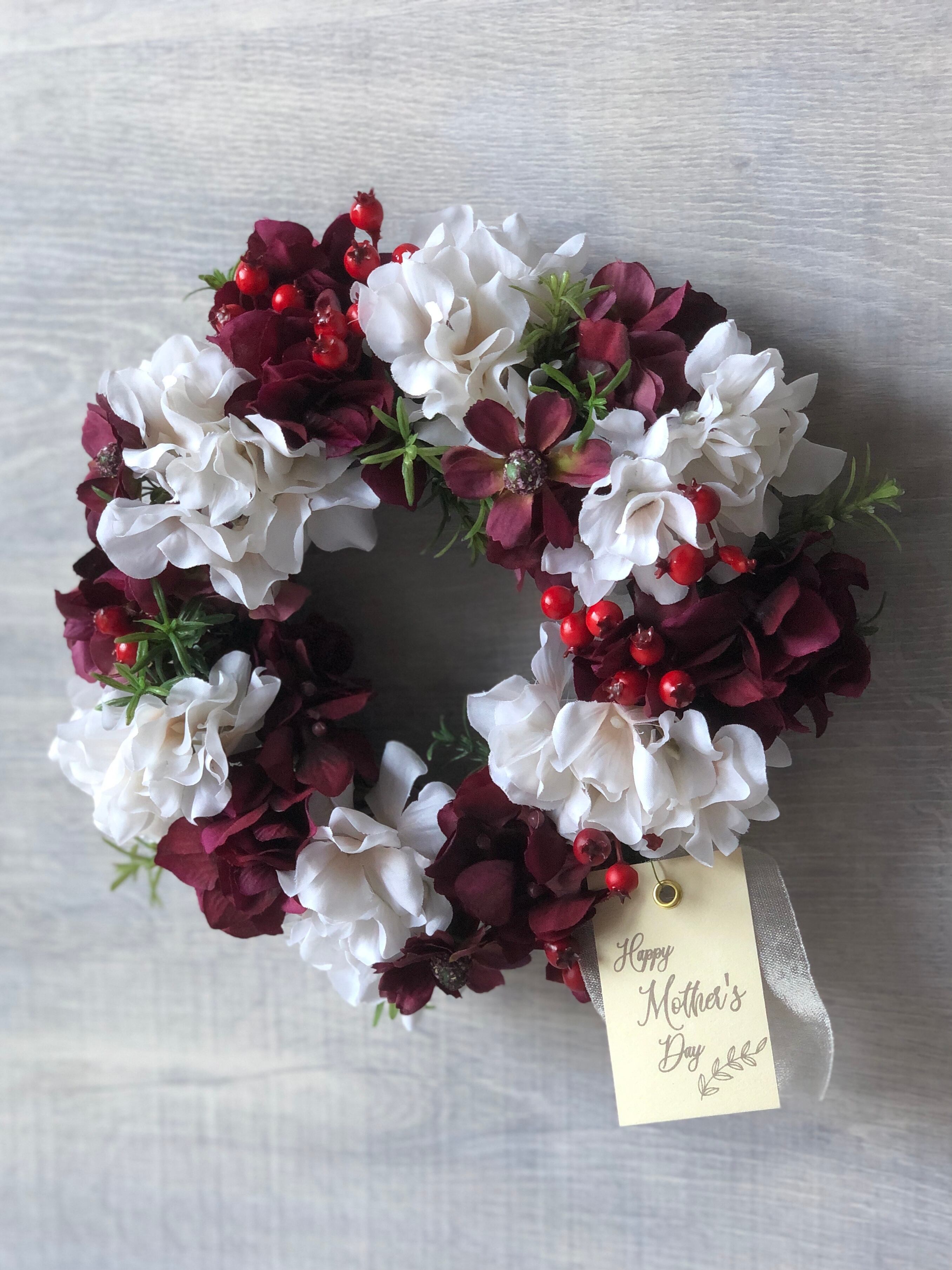 フラワーリースは厳選した高品質のアーティフィシャルフラワー(造花)をふんだんに使い、ホワイトとバーガンディのアジサイとアクセントにチョコレートコスモスを使用。品のある可愛らしい仕上がり。アーティフィシャルなので、ずっと飾れるのもポイントです。